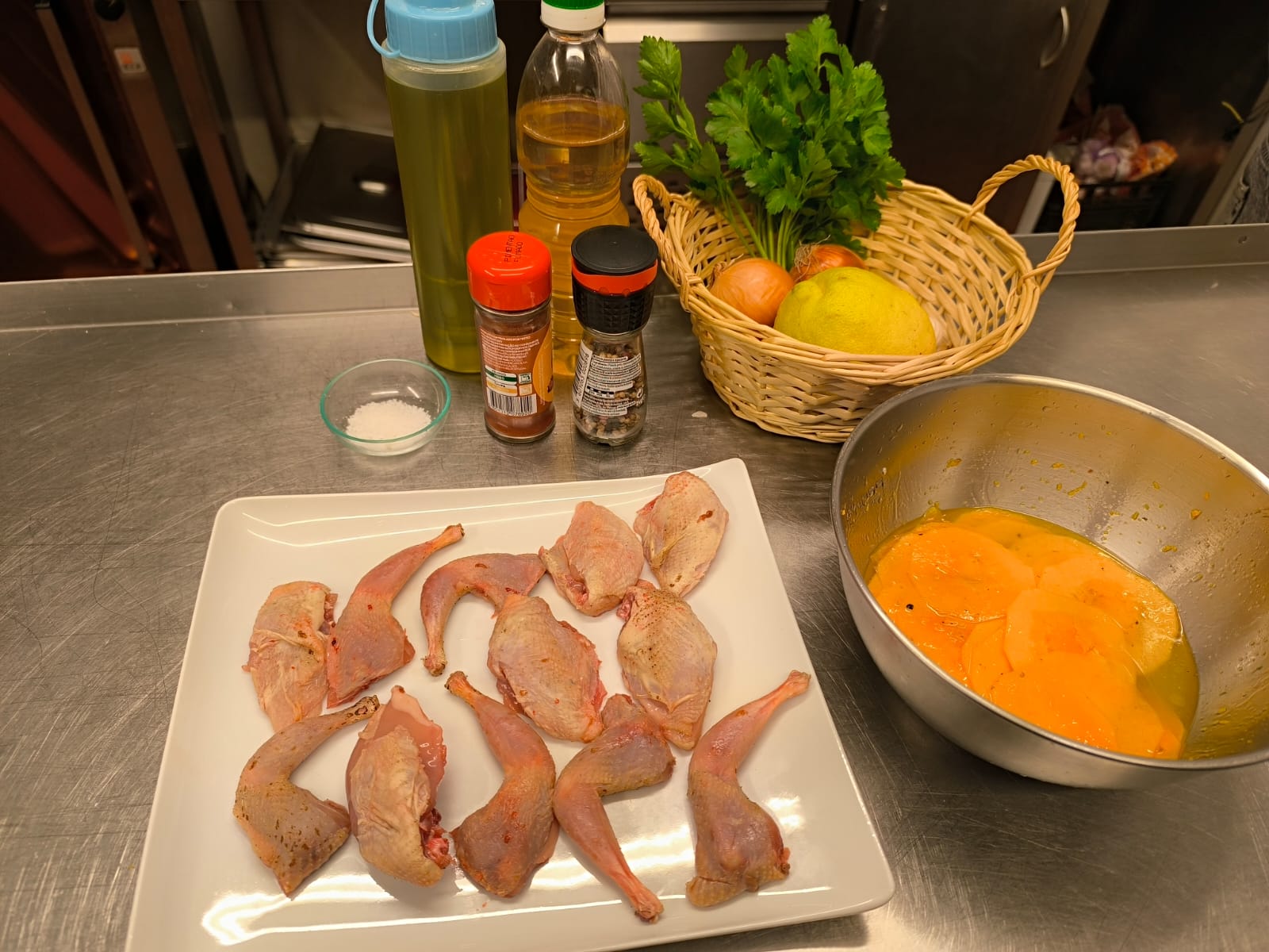 A entrada, “Carpaccio de abóbora com codorniz grelhada e molho escabeche”, baseia-se numa técnica de corte fino aplicada à abóbora manteiga, previamente marinada em citrinos e azeite, preservando textura, cor e valor nutricional. A codorniz é preparada através de grelha, técnica que permite uma confeção rápida, com controlo da gordura adicionada e valorização do sabor natural da carne. O molho escabeche, elaborado com azeite, vinagre de maçã, aromáticos e especiarias, inspira-se numa técnica tradicional portuguesa de conservação e tempero, sendo aqui reinterpretado de forma mais leve, contribuindo para complexidade aromática e equilíbrio ácido-gordo do prato.