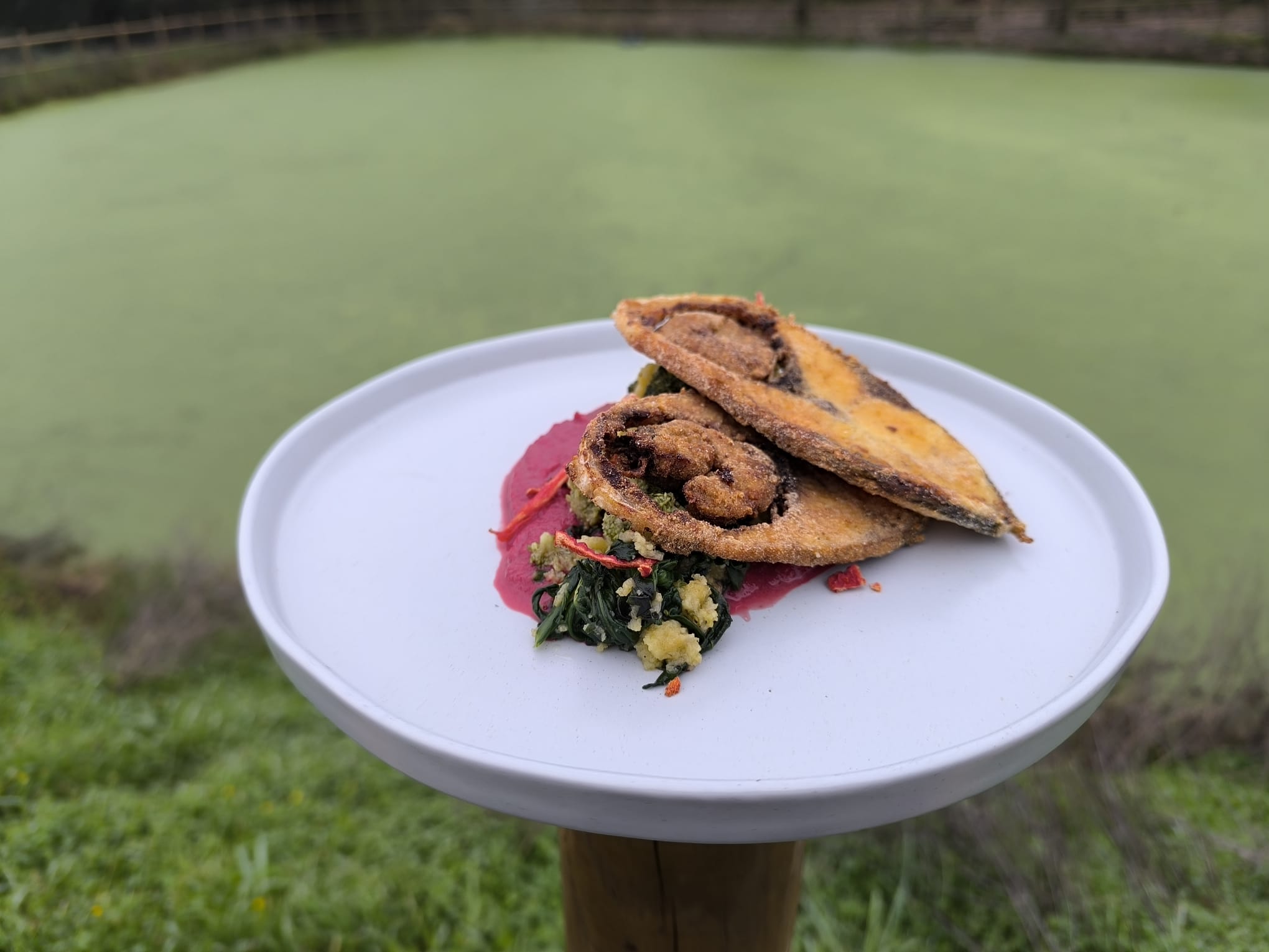 O prato principal, “Sável frito com migas de legumes e creme de beterraba”, assenta na valorização de um peixe de rio emblemático da região do Médio Tejo. O sável é submetido a fritura controlada em gordura vegetal, técnica tradicional que garante textura crocante exterior e suculência interior, sendo equilibrada pela presença de acompanhamentos de base vegetal. As migas de legumes incorporam hortícolas de época e broa de milho, utilizando uma técnica de salteado em azeite que promove a ligação dos ingredientes e a concentração de sabores. O creme de beterraba é obtido por cozedura suave e trituração, resultando numa preparação aveludada que acrescenta cor, fibra e compostos antioxidantes, contribuindo para o equilíbrio visual e nutricional do prato.