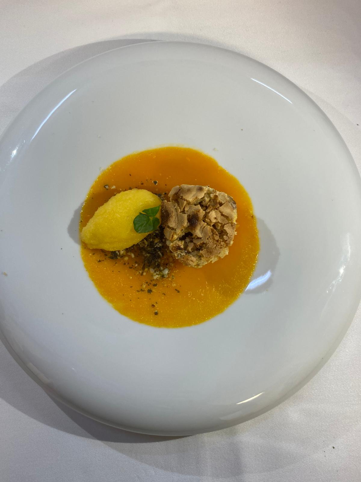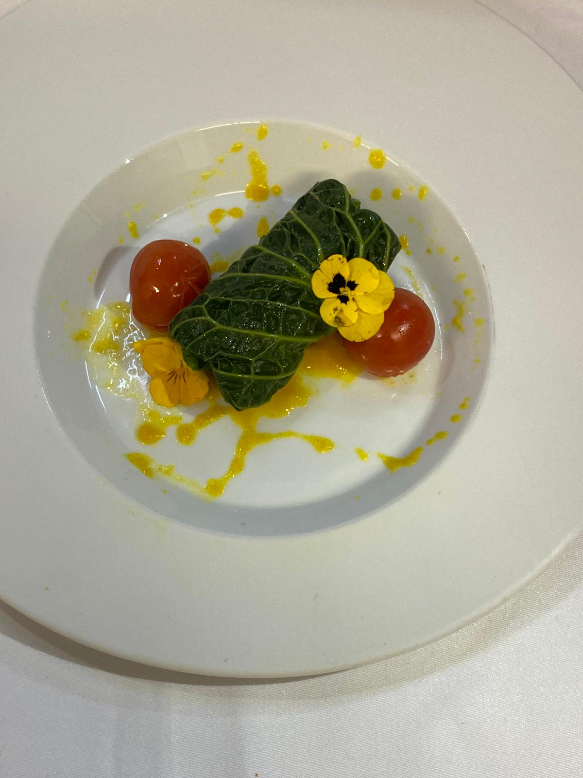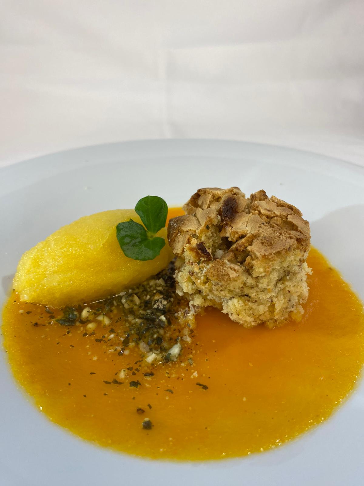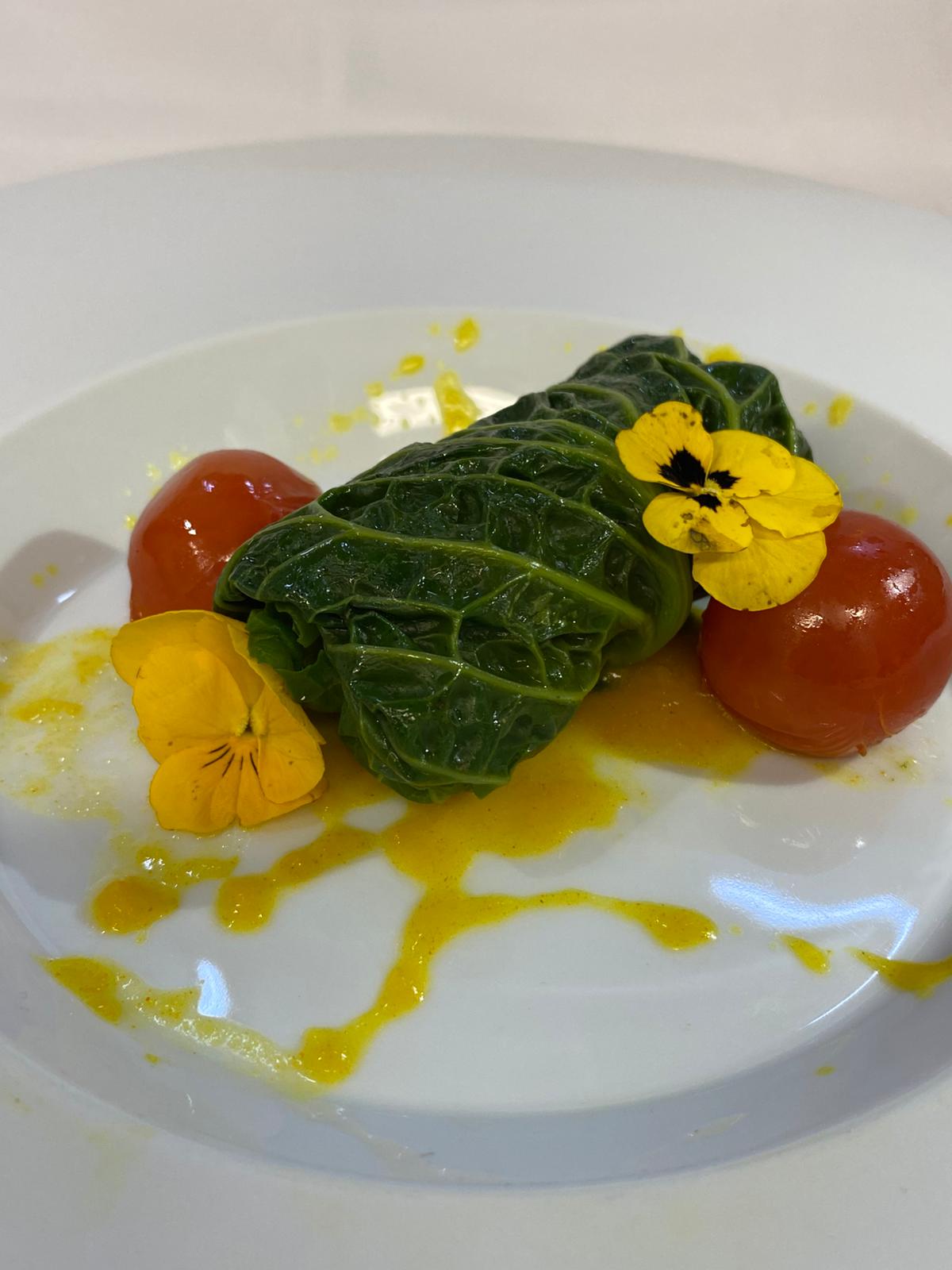Todos os ingredientes são de base local e respeitam a sazonalidade. Neste caso optou-me por uma ementa de inverno que une a cultura serrana da Região Centro ao Porto Marinho da Figueira da Foz. São exemplo a cavala, um peixe que é de todo o interesse social, cultural, económico e ambiental promover. Foi desvalorizado por largos anos, sendo, contudo, riquíssimo em ómega 3 e vitaminas do complexo B. Relativamente à redução de desperdícios temos como exemplo a abóbora e a couve. Sendo que a primeira é utilizada na açorda e na sobremesa, onde são incorporadas até as pevides.