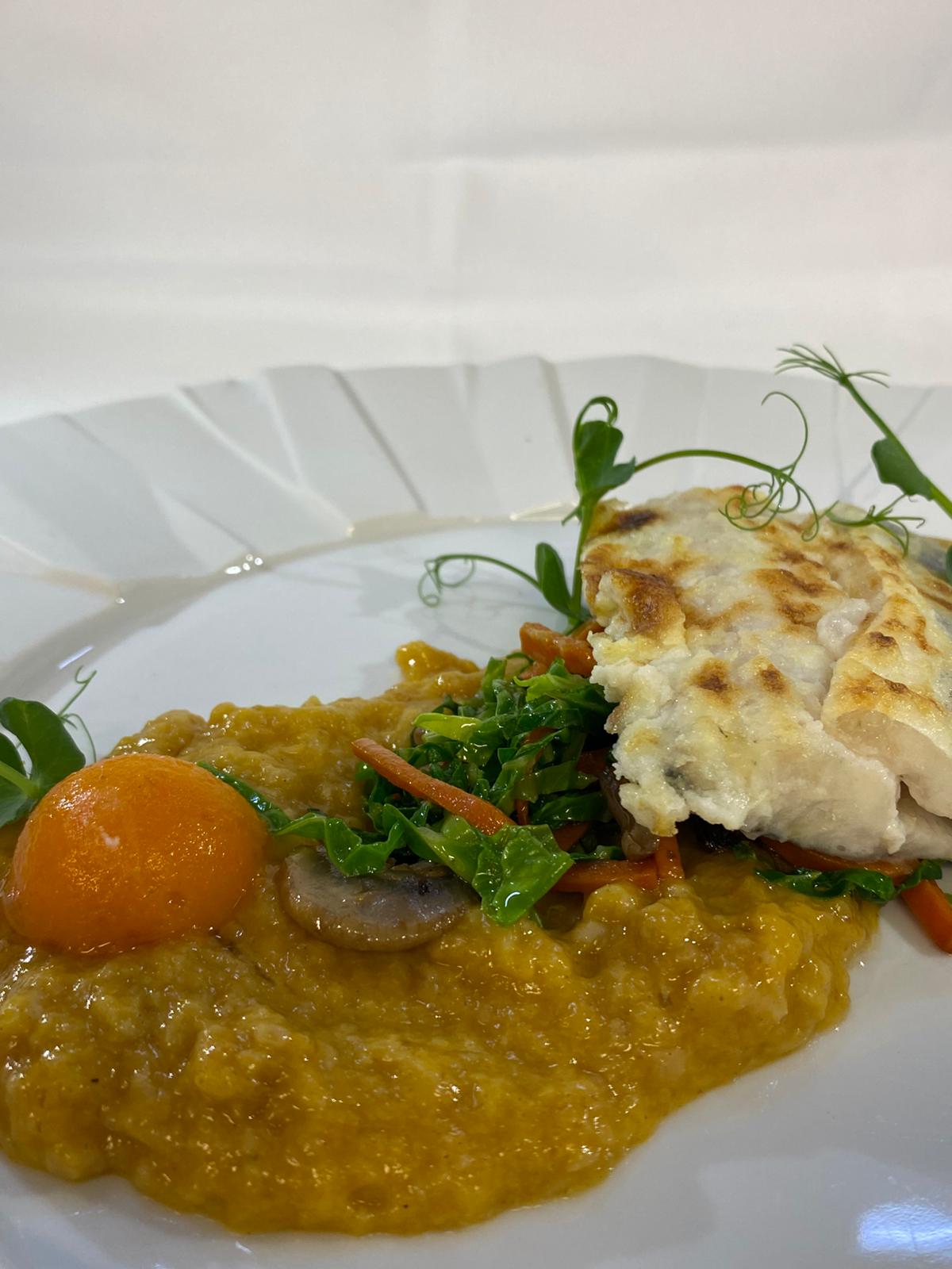 Esta ementa é facilmente convertida em vegetariana, fazendo apenas a substituição da proteína animal. Na entrada, por soja granulada e o peixe por seitan. Esta transformação é importante porque só temos de fazer duas pequenas alterações, o que permite uma melhor eficiência e eficácia de recursos e desperdícios e um atendimento ao cliente mais rápido e satisfatório.