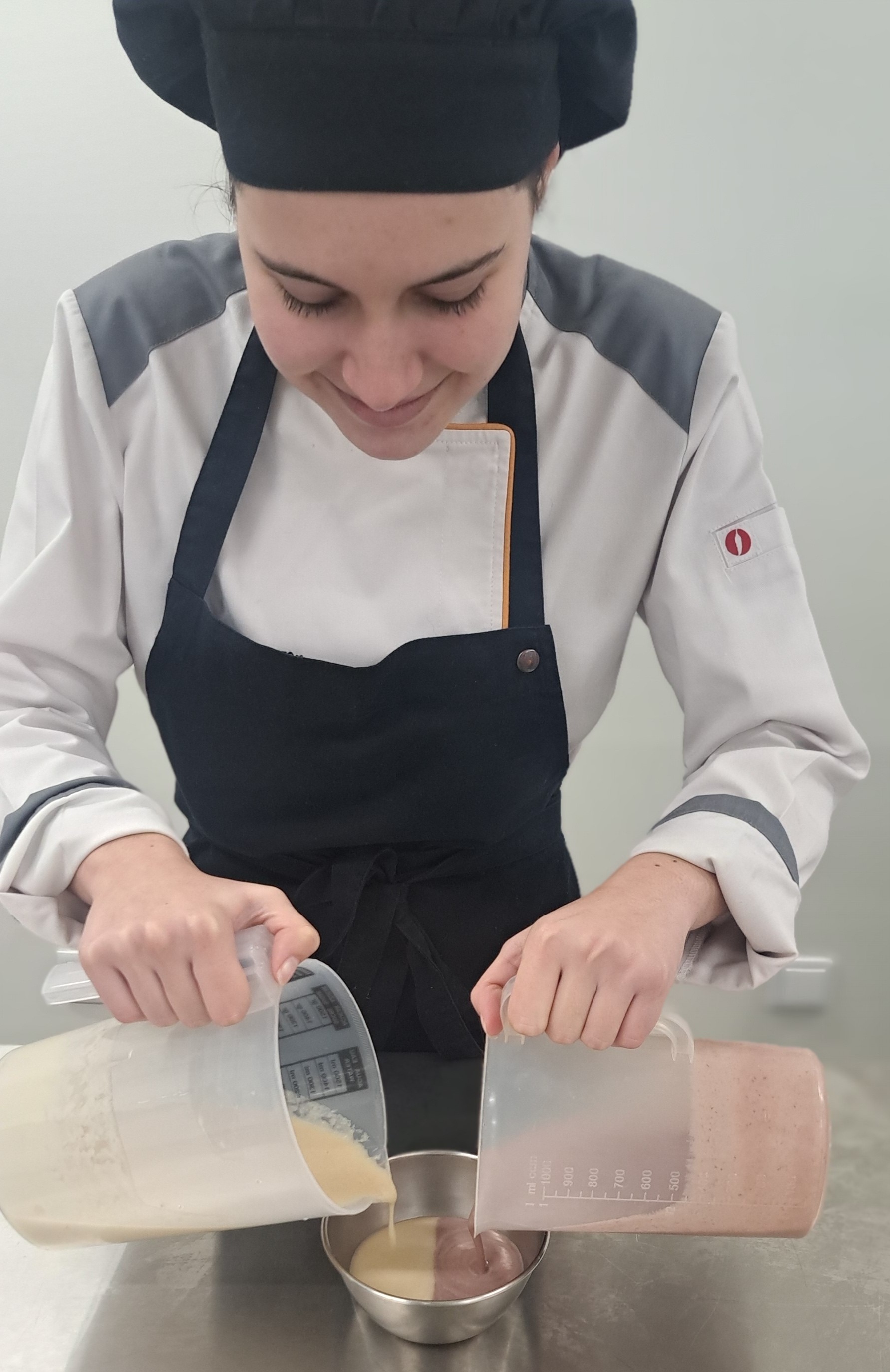 Para a nossa sobremesa, pegamos em duas iguarias bem conhecidas dos portugueses que são o arroz doce e as peras bêbedas e fizemos a nossa interpretação e adaptação ao nosso público alvo, substituindo o vinho tinto pela água de cozedura de beterraba que lhe vai dar a cor característica do Piteu. A escolha do arroz doce também ela foi pensando na pegada ecológica, utilizando um ex-líbris aqui da zona que é o arroz de Estarreja para a nossa sobremesa complementando a doçaria com um crocante com base de aveia e farinha de arroz.