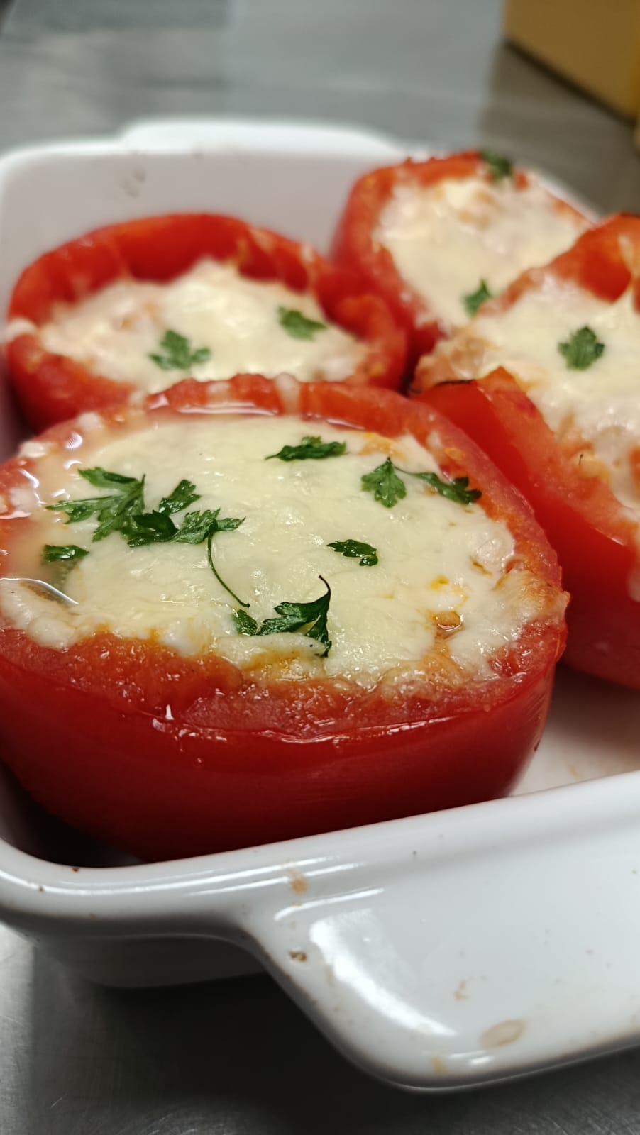 O prato principal acompanhado de batata cozida fornece cerca de 420 kcal, constituindo a principal fonte energética da refeição. Contém aproximadamente 18 g de lípidos, dos quais 5 g são lípidos saturados, associados sobretudo ao ovo e ao queijo utilizado na gratinação. Em relação aos hidratos de carbono, apresenta cerca de 38 g, maioritariamente provenientes da batata, sendo apenas 6 g correspondentes a açúcares naturais. Este prato fornece também cerca de 6 g de fibra, contribuindo para a saciedade. O teor proteico é elevado, com aproximadamente 28 g de proteínas, essenciais para o crescimento, manutenção muscular e reparação dos tecidos. O teor de sal situa-se nos 0,9 g, permanecendo dentro dos limites recomendados para uma refeição principal equilibrada.