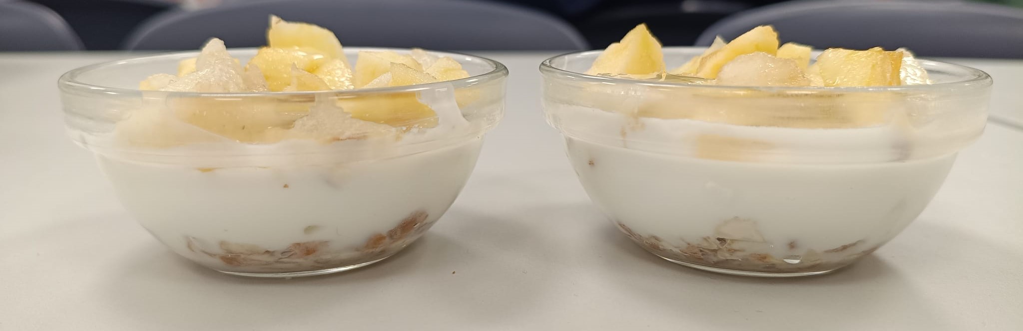 A sobremesa apresenta um valor energético aproximado de 230 kcal. Contém cerca de 7 g de lípidos, dos quais 2 g são lípidos saturados, provenientes sobretudo do iogurte. Fornece aproximadamente 32 g de hidratos de carbono, incluindo 24 g de açúcares, maioritariamente naturais da fruta e do mel. Em termos de fibra alimentar, contribui com cerca de 4 g, provenientes da fruta e da amêndoa. Apresenta ainda cerca de 8 g de proteínas, importantes para a manutenção da massa muscular e funções metabólicas. O teor de sal é baixo, rondando os 0,2 g, o que torna esta sobremesa adequada do ponto de vista nutricional.