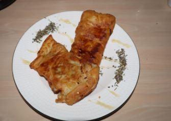 A entrada é constituída por crepes de massa filo recheados com uma mistura de legumes salteados (repolho, alho-francês, cenoura e aipo), temperados com molho de soja e azeite.