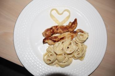 Massa Alfredo com frango grelhado: €3,65 para 2 porções; €1,80 por porção