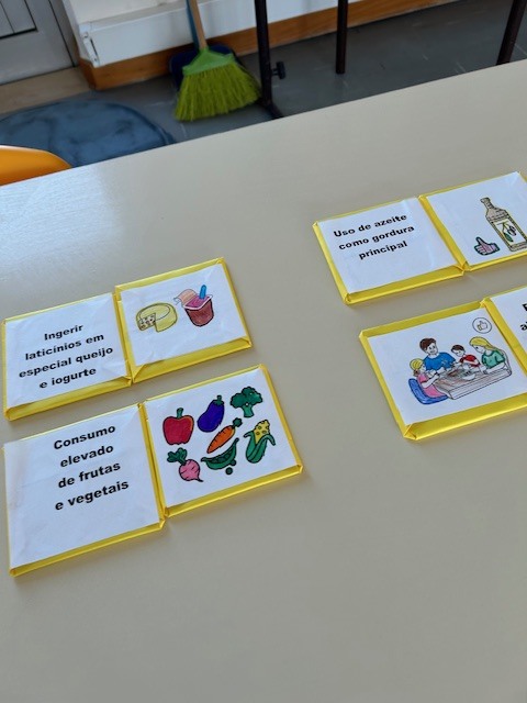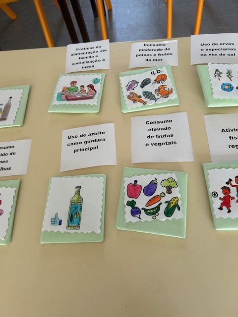 Foram coloridos os desenhos e colocados em cartão para melhor manuseamento durante o jogo.